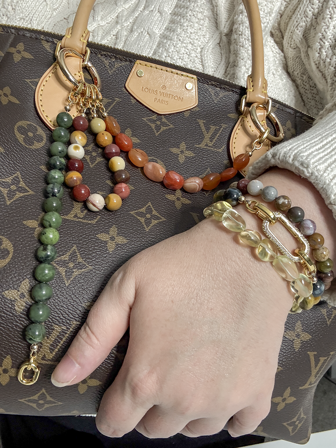 The desire I saw for high quality but still affordable adornments for our treasured bags led me to design and create a line of bag charms made from natural gemstones and real gold and silver that can be worn three different ways and can also be converted to wear as a bracelet.